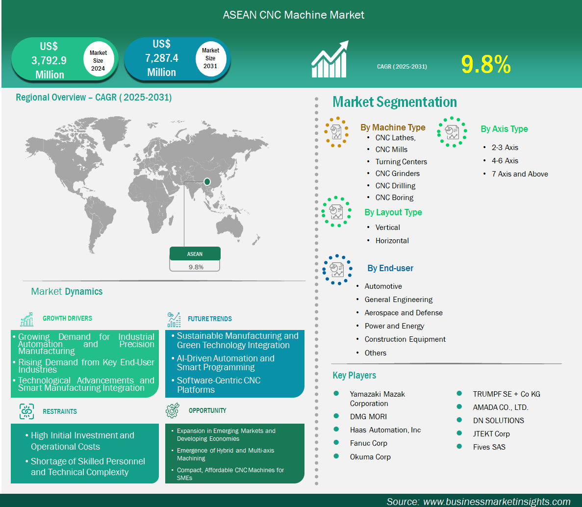 Der Markt für CNC-Maschinen in der ASEAN-Region wird im Jahr 2024 auf 3.792,9 Millionen US-Dollar geschätzt und soll bis 2031 7.287,4 Millionen US-Dollar erreichen.