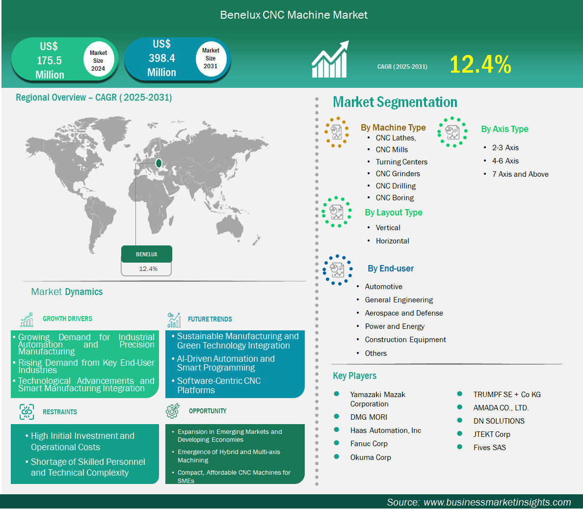 Der Markt für CNC-Maschinen in den Benelux-Ländern wird im Jahr 2024 auf 175,5 Millionen US-Dollar geschätzt und soll bis 2031 398,4 Millionen US-Dollar erreichen.