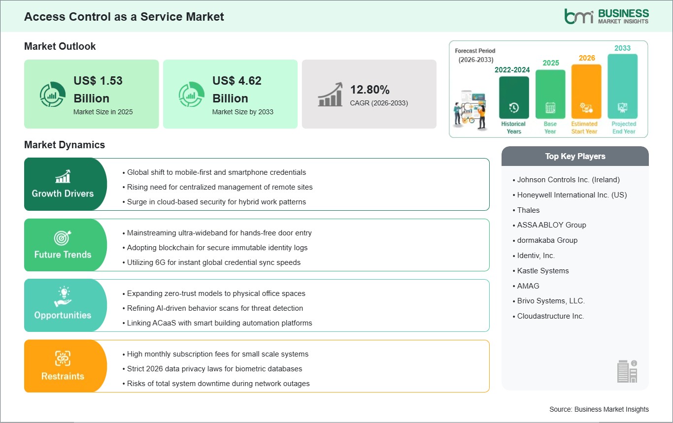 The Access Control as a Service Market is valued at US$ 1.53 Billion in 2025, it is projected to reach US$ 4.62 Billion by 2033.