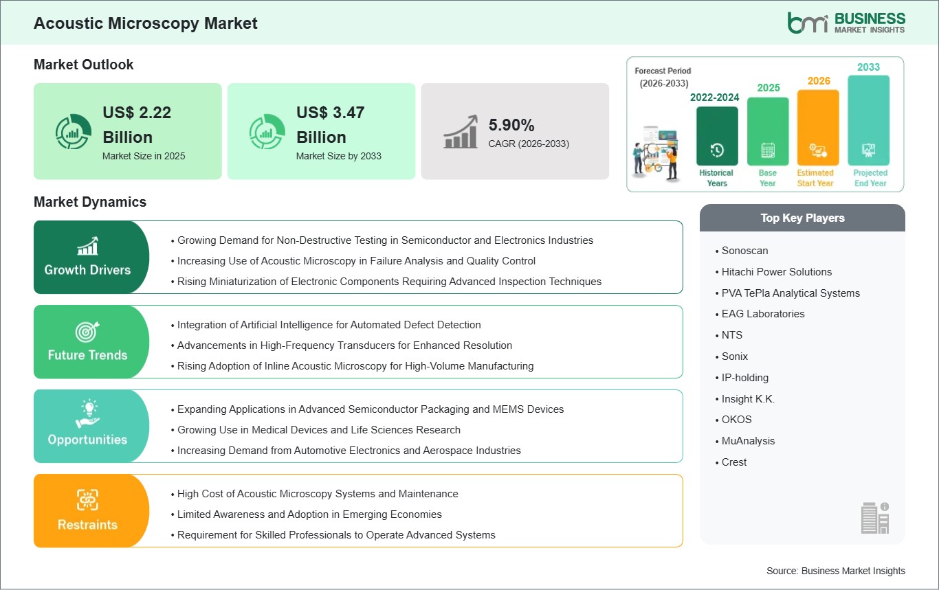 As per our report Acoustic Microscopy Market, the market size is valued at US$ 2.22 Billion in 2025, projecting it to reach US$ 3.47 Billion by 2033. This translates to a CAGR of approximately 5.90% during the forecast period.
