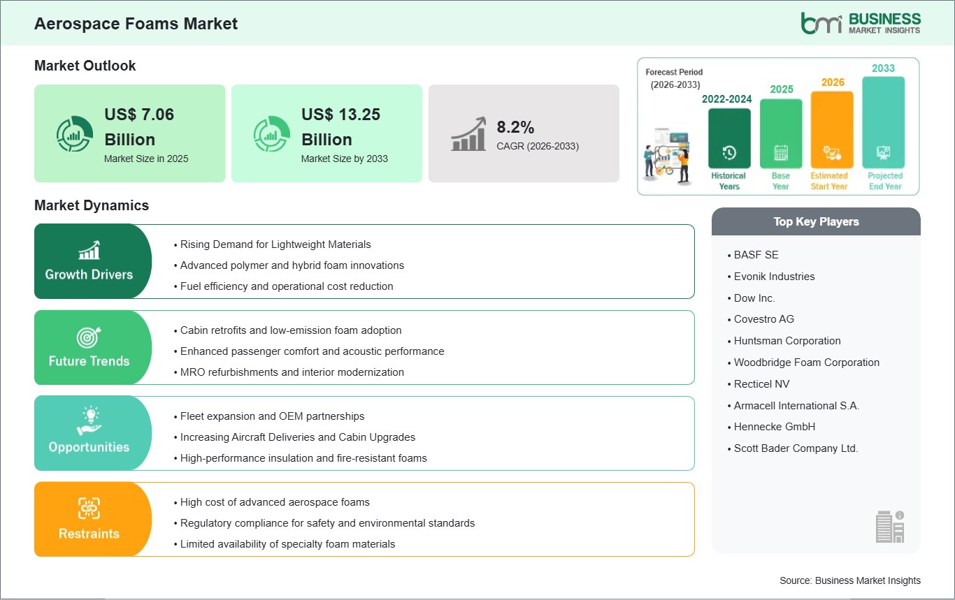 As per our report Aerospace Foams Market, the market size is valued at US$ 7.06 Billion in 2025, projecting it to reach US$ 13.25 Billion by 2033. This translates to a CAGR of approximately 8.2% during the forecast period.