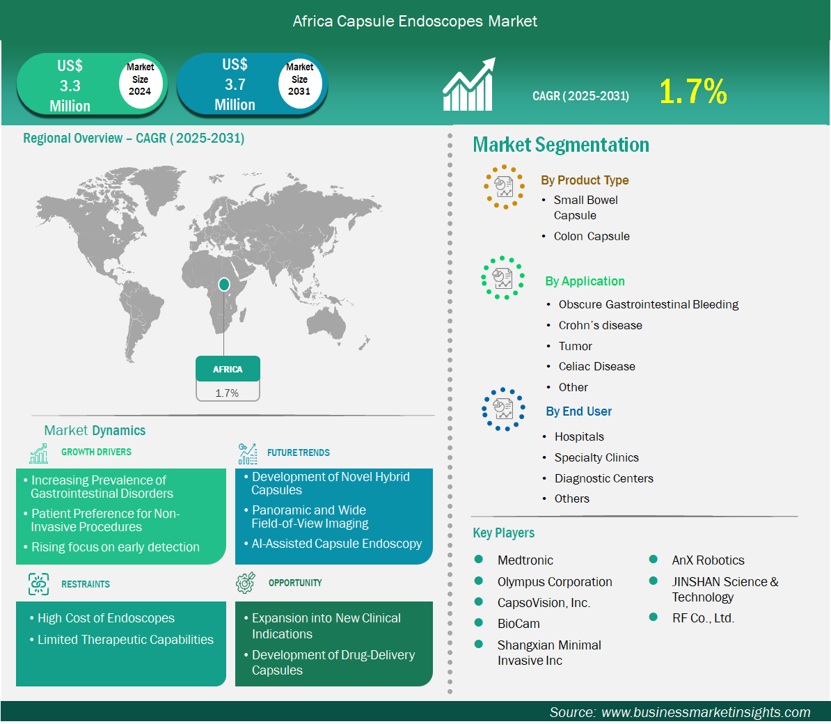 The Africa Capsule Endoscopes Market is valued at US$ 3.3 Million in 2024, it is projected to reach US$ 3.7 Million by 2031.
