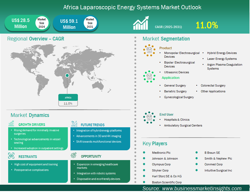 The Africa Laparoscopic Energy Systems Market is valued at US$ 28.5 Million in 2024, it is projected to reach US$ 59.1 Million by 2031.