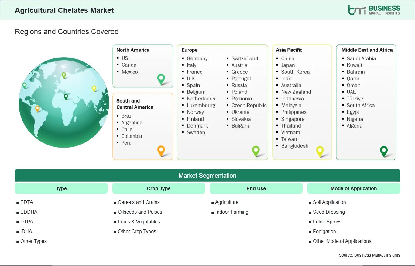 North America and Europe are mature markets, characterized by high adoption of precision agriculture and advanced nutrient management practices. These regions emphasize sustainable farming and environmental regulations, driving the use of eco-friendly chelates.