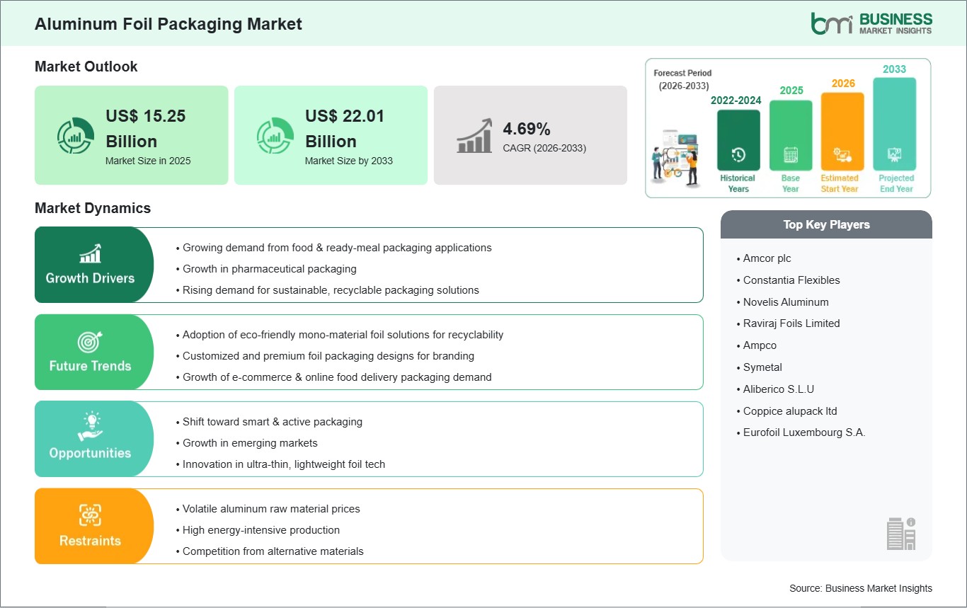 The Aluminum Foil Packaging Market size is expected to reach US$ 22.01 Billion by 2033 from US$ 15.25 Billion in 2025. The market is estimated to record a CAGR of 4.69% from 2026 to 2033.
