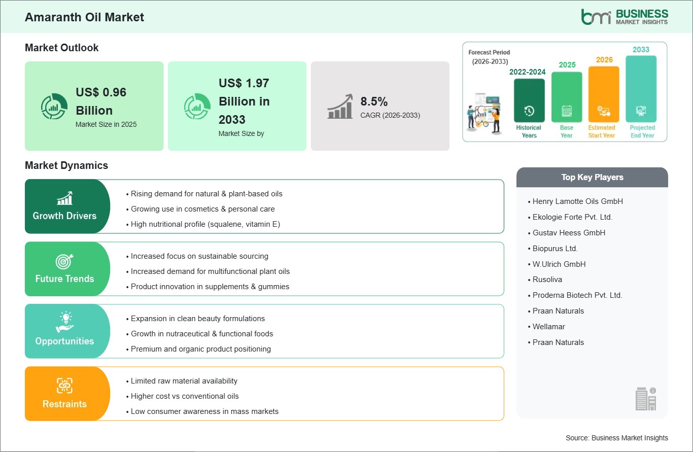 The Amaranth Oil Market is valued at US$ 0.96 Billion in 2025, it is projected to reach US$ 1.97 Billion in 2033 by .