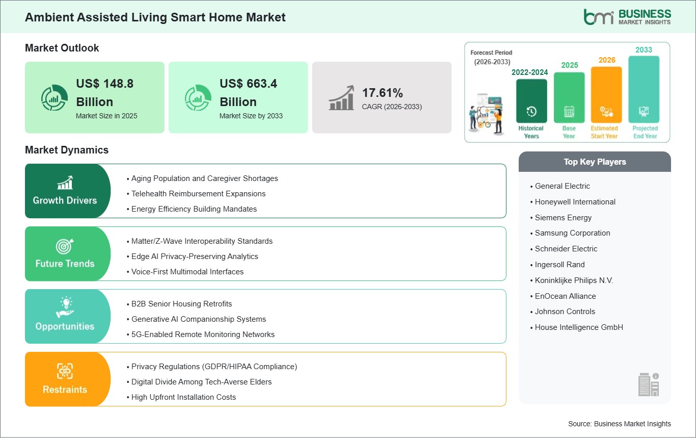 The Ambient Assisted Living Smart Home Market is valued at US$ 148.8 Billion in 2025, it is projected to reach US$ 663.4 Billion by 2033.