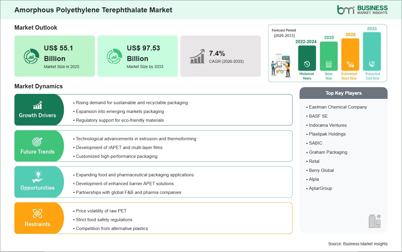 The Amorphous Polyethylene Terephthalate Market is valued at US$ 55.1 Billion in 2025, it is projected to reach US$ 97.53 Billion by 2033.