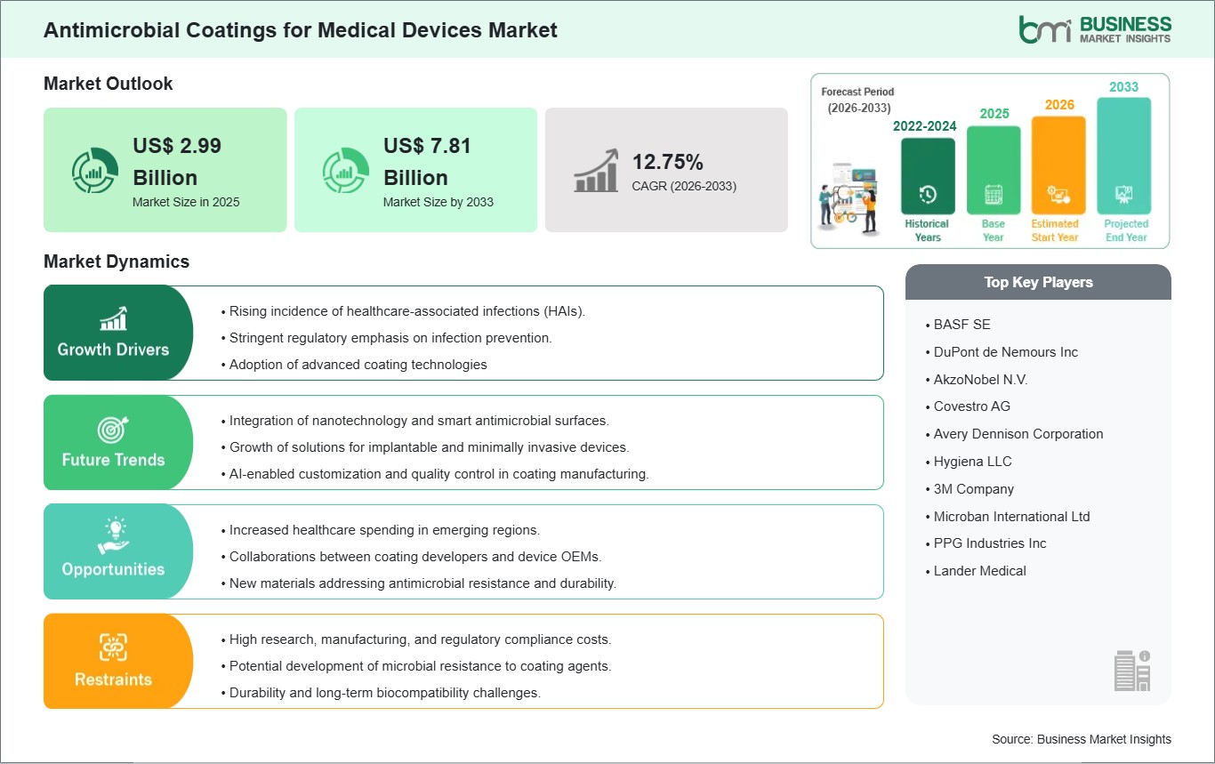 The Antimicrobial Coatings for Medical Devices Market is valued at US$ 2.99 Billion in 2025, it is projected to reach US$ 7.81 Billion by 2033.
