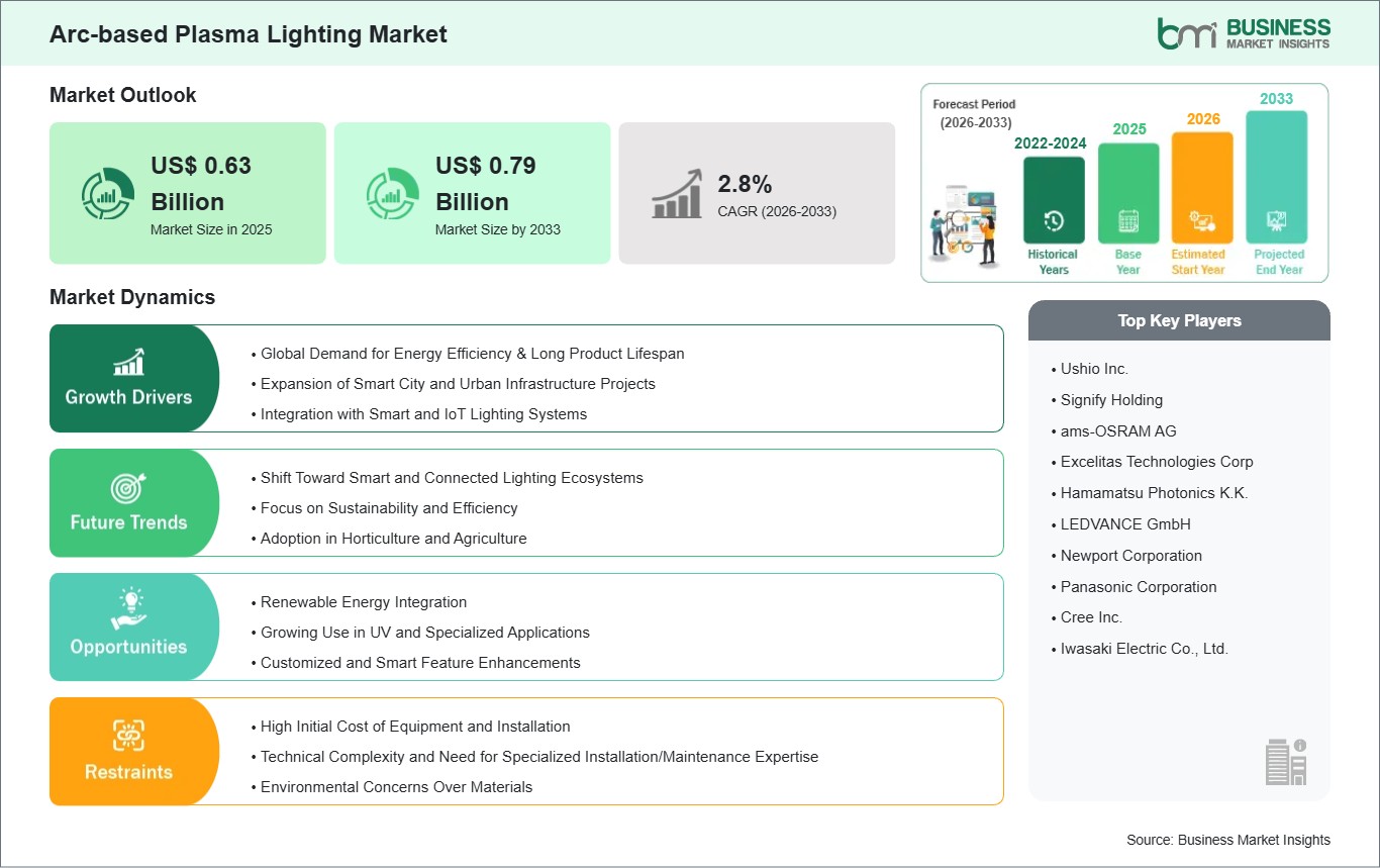 The Arc-based Plasma Lighting Market is valued at US$ 0.63 Billion in 2025, it is projected to reach US$ 0.79 Billion by 2033.