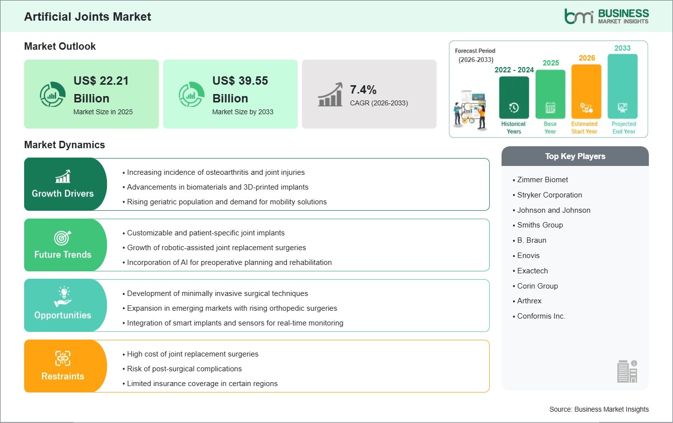As per our report Artificial Joints Market, the market size is valued at US$ 22.21 Billion in 2025, projecting it to reach US$ 39.55 Billion by 2033. This translates to a CAGR of approximately 7.4% during the forecast period.