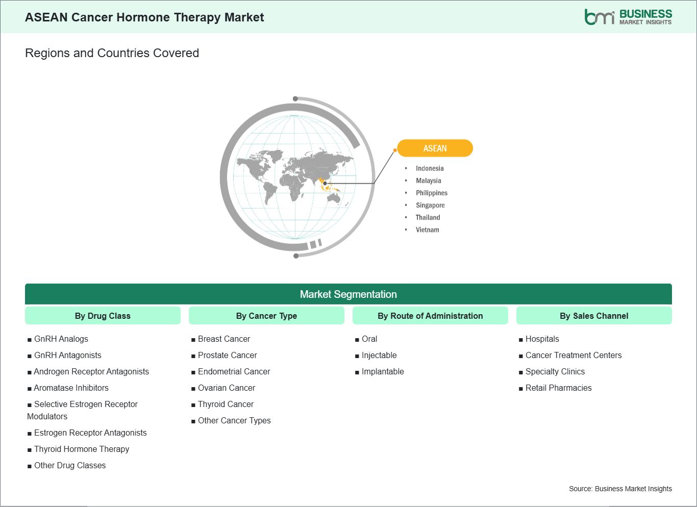 Key segments that contributed to the derivation of the ASEAN cancer hormone therapy market analysis are drug class, cancer type, route of administration, and sales channel.
