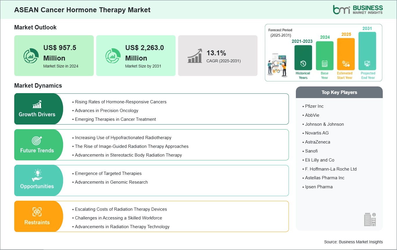 The ASEAN Cancer Hormone Therapy Market is valued at US$ 957.5 Million in 2024, it is projected to reach US$ 2,263.0 Million by 2031.