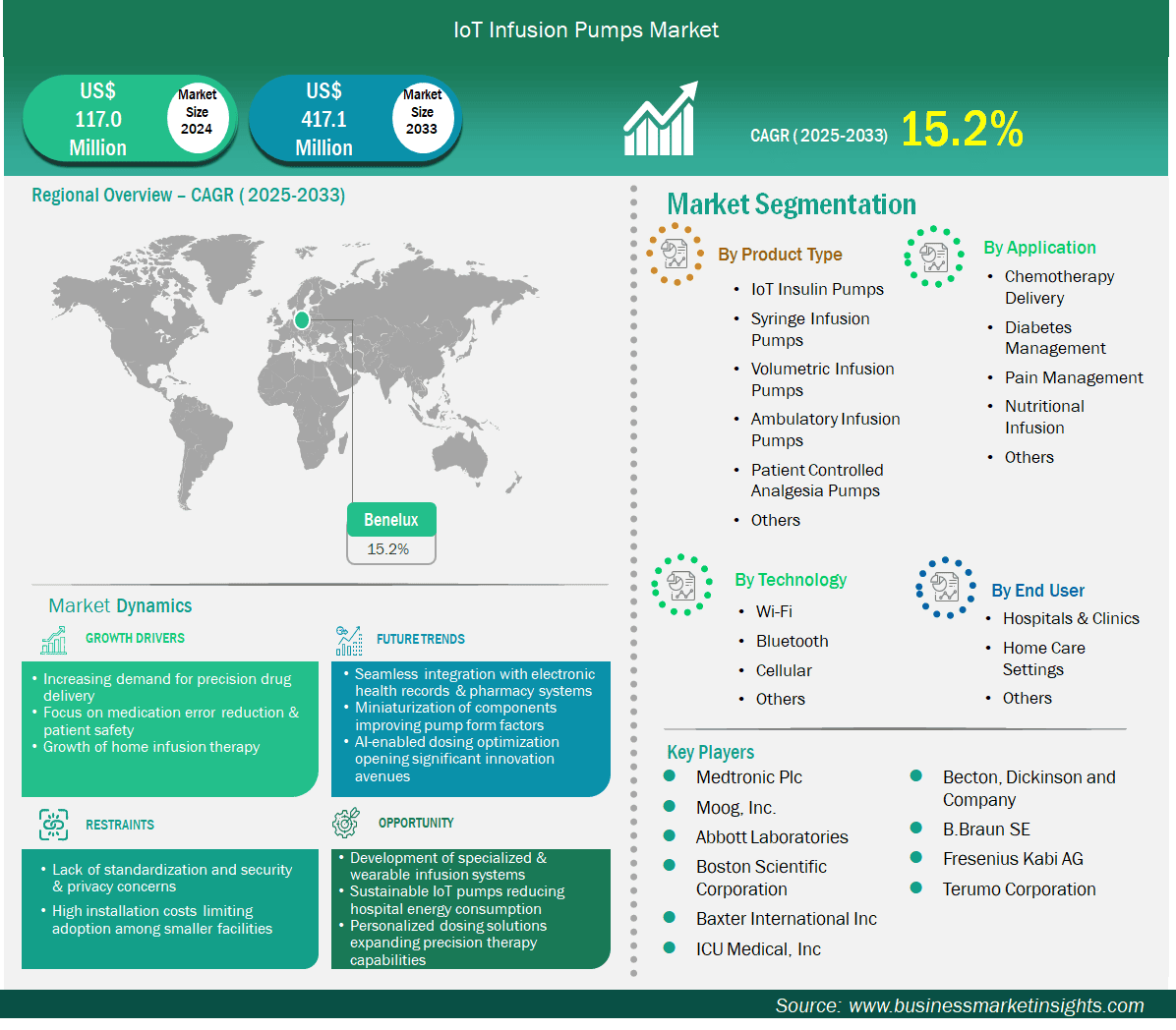 Medtronic Plc, Moog, Inc., Abbott Laboratories, Boston Scientific Corporation, Baxter International Inc, Becton, Dickinson and Company, B. Braun SE, ICU Medical Inc., Fresenius Kabi AG, Terumo Corporation, are among the key players operating in the market. These players adopt strategies such as expansion, product innovation, and mergers and acquisitions to stay competitive in the market and offer innovative products to their consumers.
