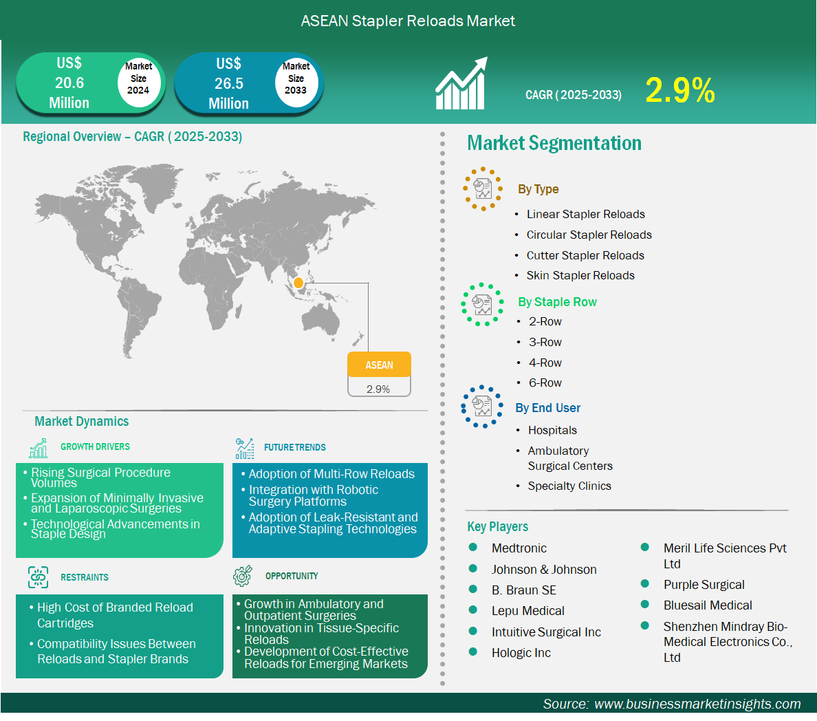 The ASEAN stapler reloads market size is expected to reach US$ 26.5 million by 2033 from US$ 20.6 million in 2024. The market is estimated to record a CAGR of 2.9% from 2025 to 2033.