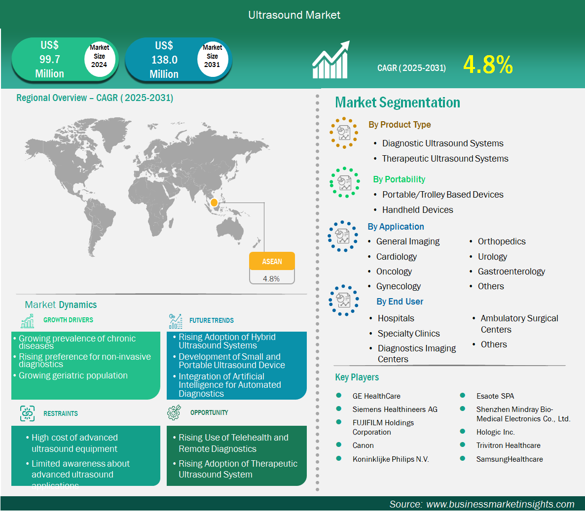 The ASEAN Ultrasound Market is valued at US$ 99.7 Million in 2024, it is projected to reach US$ 138.0 Million by 2031.