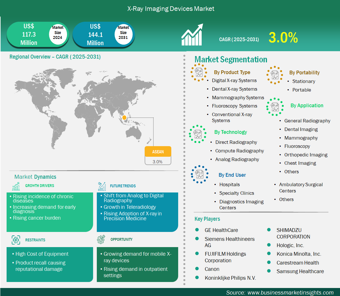 The ASEAN X-Ray Imaging Devices Market is valued at US$ 117.3 Million in 2024, it is projected to reach US$ 144.1 Million by 2031.