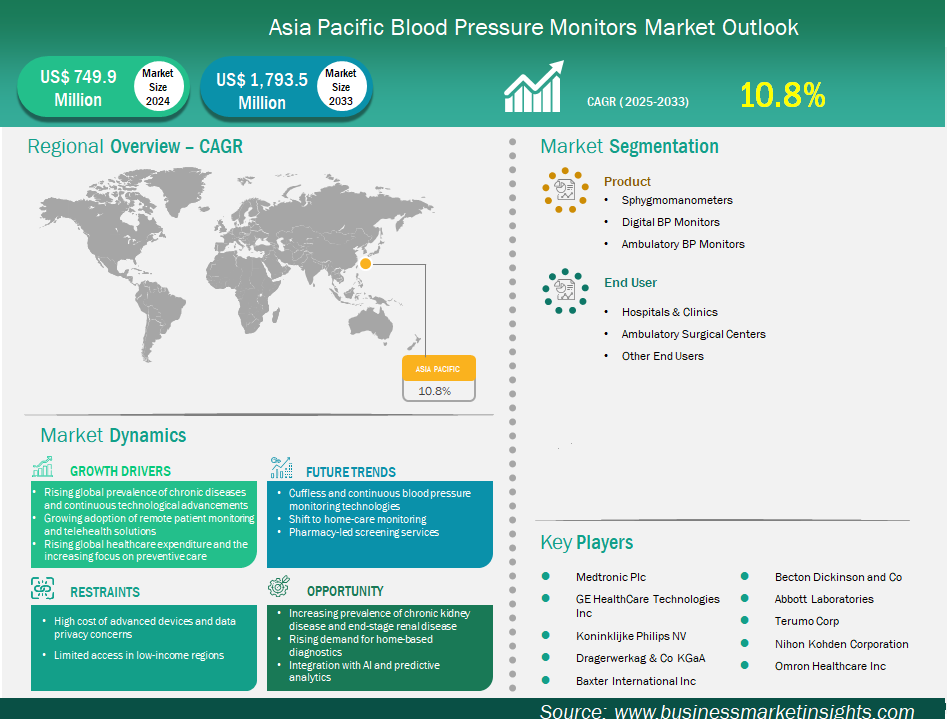 As per our report Asia Pacific Blood Pressure Monitors Market, the market size is valued at US$ 749.9 Million in 2024, projecting it to reach US$ 1,793.5 Million by 2033. This translates to a CAGR of approximately 10.8% during the forecast period.
