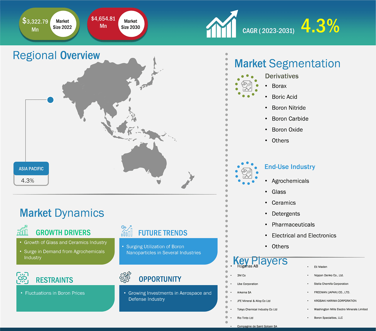 The Asia Pacific Boron Market is valued at US$ 3,322.79 Million in 2023, it is projected to reach US$ 4,654.81 Million by 2031.