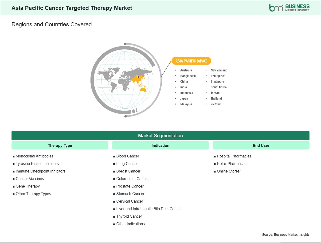 The "Asia Pacific Cancer Targeted Therapy Market Size and Forecast (2021–2031)" report provides a detailed analysis of the market covering below areas: