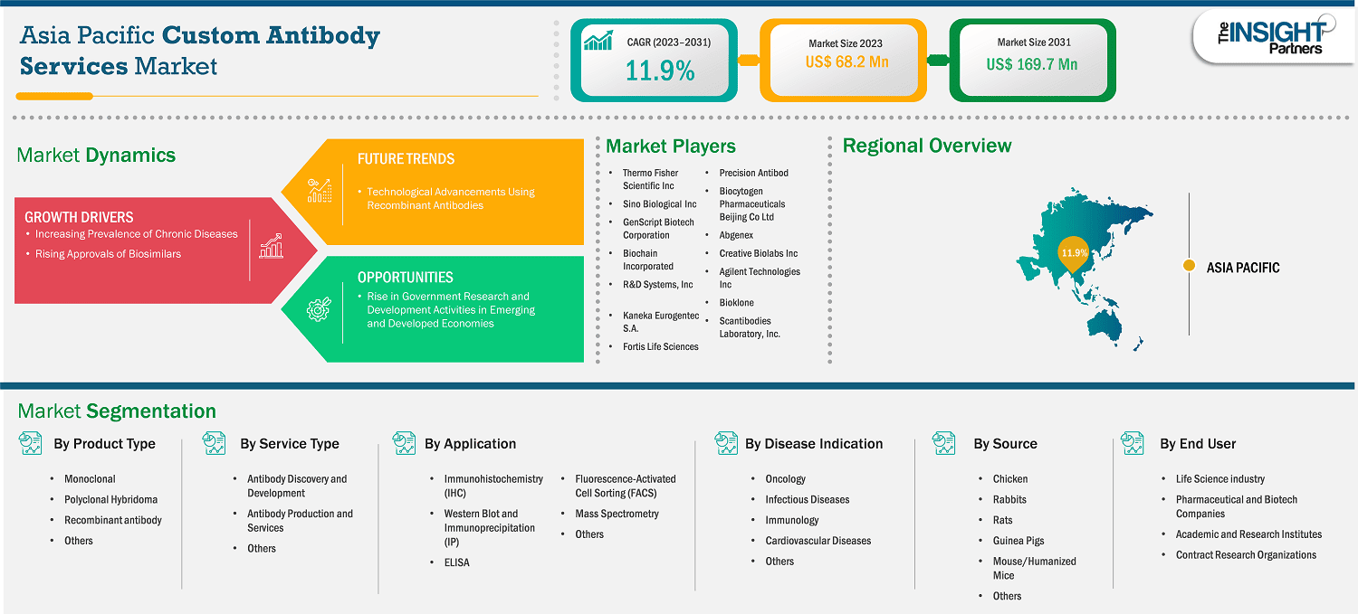 The Asia Pacific custom antibody services market size is expected to reach US$ 167.86 million by 2031 from US$ 68.24 million in 2023. The market is estimated to record a CAGR of 11.9% from 2023 to 2031.