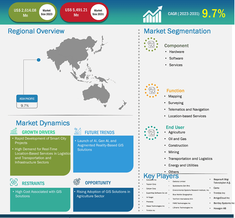 The Asia Pacific geographic information system market size is expected to reach US$ 5,491.21 million by 2031 from US$ 2,614.08 million in 2023. The market is estimated to record a CAGR of 9.7% from 2023 to 2031.