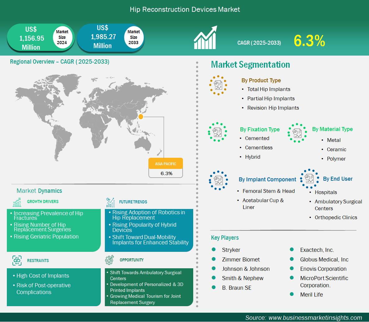 As per our report Asia Pacific Hip Reconstruction Devices Market, the market size is valued at US$ 1,156.95 Million in 2024, projecting it to reach US$ 1,985.27 Million by 2033. This translates to a CAGR of approximately 6.3% during the forecast period.