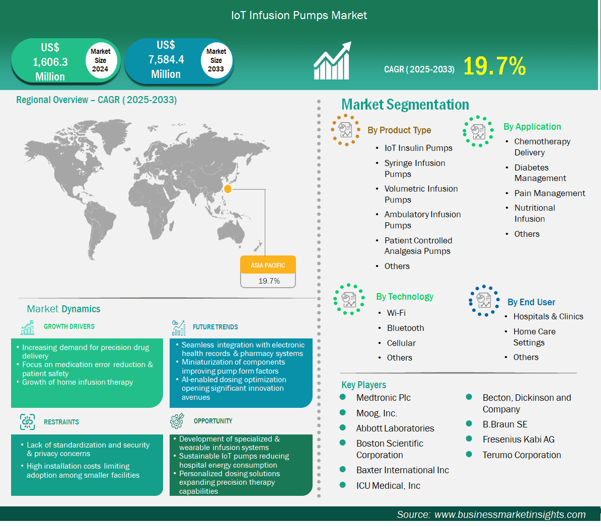 Medtronic Plc, Moog, Inc., Abbott Laboratories, Boston Scientific Corporation, Baxter International Inc, Becton, Dickinson and Company, B. Braun SE, ICU Medical Inc., Fresenius Kabi AG, Terumo Corporation, are among the key players operating in the market. These players adopt strategies such as expansion, product innovation, and mergers and acquisitions to stay competitive in the market and offer innovative products to their consumers.