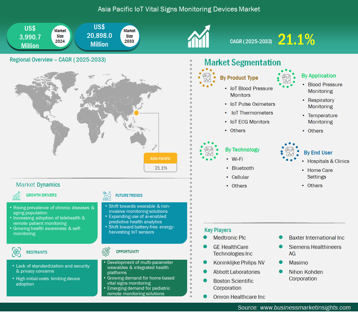 The Asia Pacific IoT vital signs monitoring devices market size is expected to reach US$ 20,898.0 million by 2033 from US$ 3,990.7 million in 2024. The market is estimated to record a CAGR of 21.1% from 2025 to 2033.