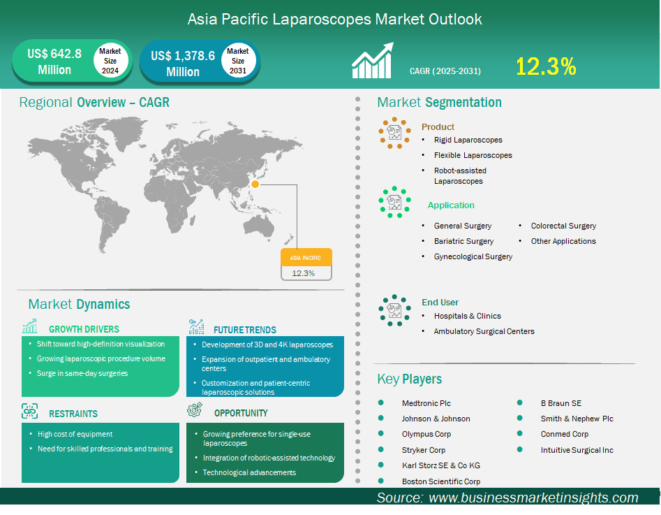 The Asia Pacific Laparoscopes Market is valued at US$ 642.8 Million in 2024, it is projected to reach US$ 1,378.6 Million by 2031.