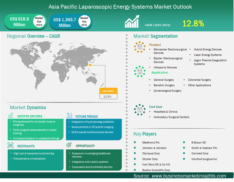 The Asia Pacific Laparoscopic Energy Systems Market is valued at US$ 618.8 Million in 2024, it is projected to reach US$ 1,365.7 Million by 2031.