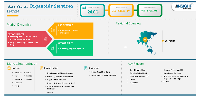 The Asia Pacific organoids services market size is expected to reach US$ 2,327.10 million by 2031 from US$ 515.83 million in 2024. The market is estimated to record a CAGR of 24.0% from 2024 to 2031.