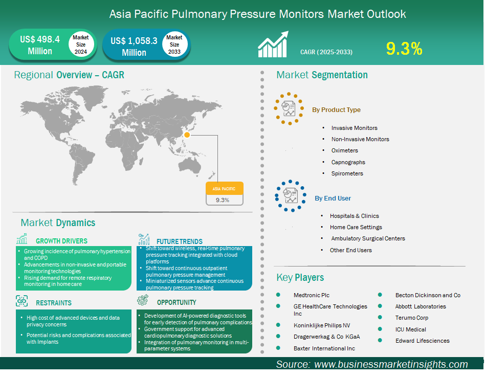 As per our report Asia Pacific Pulmonary Pressure Monitors Market, the market size is valued at US$ 498.4 Million in 2024, projecting it to reach US$ 1,058.3 Million by 2033. This translates to a CAGR of approximately 9.3% during the forecast period.
