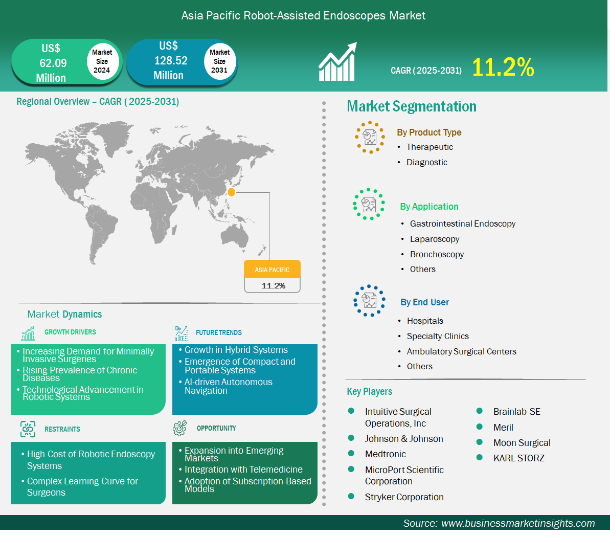 As per our report Asia Pacific Robot-Assisted Endoscopes Market, the market size is valued at US$ 62.09 Million in 2024, projecting it to reach US$ 128.52 Million by 2031. This translates to a CAGR of approximately 11.2% during the forecast period.