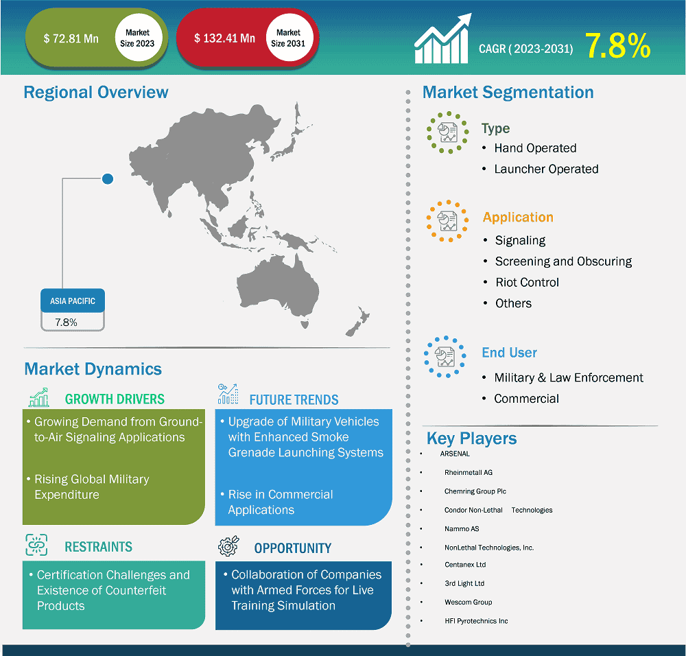 The Asia Pacific Smoke Grenade Market is valued at US$ 72.81 Million in 2023, it is projected to reach US$ 132.41 Million by 2031.