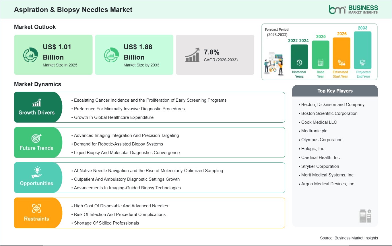 The Aspiration & Biopsy Needles Market is valued at US$ 1.01 Billion in 2025, it is projected to reach US$ 1.88 Billion by 2033.
