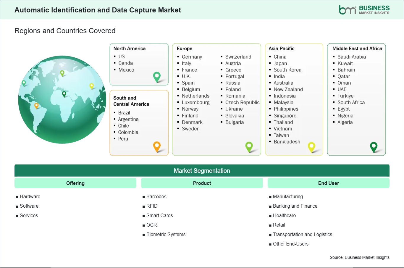 Key segments shaping the global automatic identification and data capture market include offering, product, and end user.