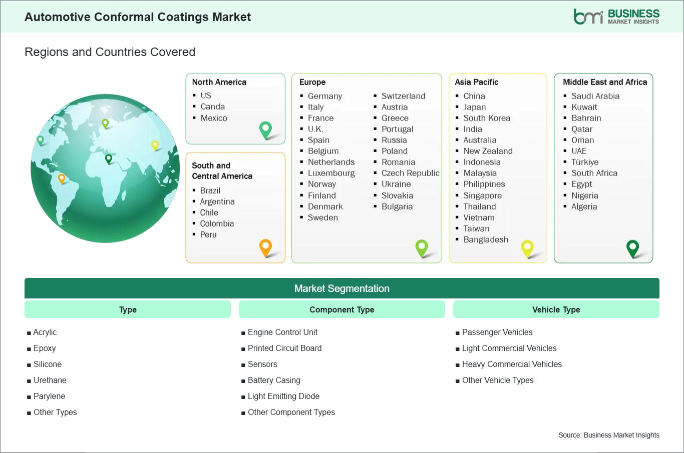 The geographical scope of the Automotive Conformal Coatings market report is divided into five regions: North America, Asia Pacific, Europe, the Middle East & Africa, and South & Central America. The Asia Pacific Agricultural Textiles Market is segmented into China, Japan, South Korea, India, Australia, New Zealand, Indonesia, Malaysia, the Philippines, Singapore, Thailand, Vietnam, Taiwan, Bangladesh, and the Rest of Asia Pacific. Asia Pacific's prominent growth in automotive electronics, especially in driver-assistance systems, electric powertrains, and connected vehicle platforms, makes it an important area for market growth.