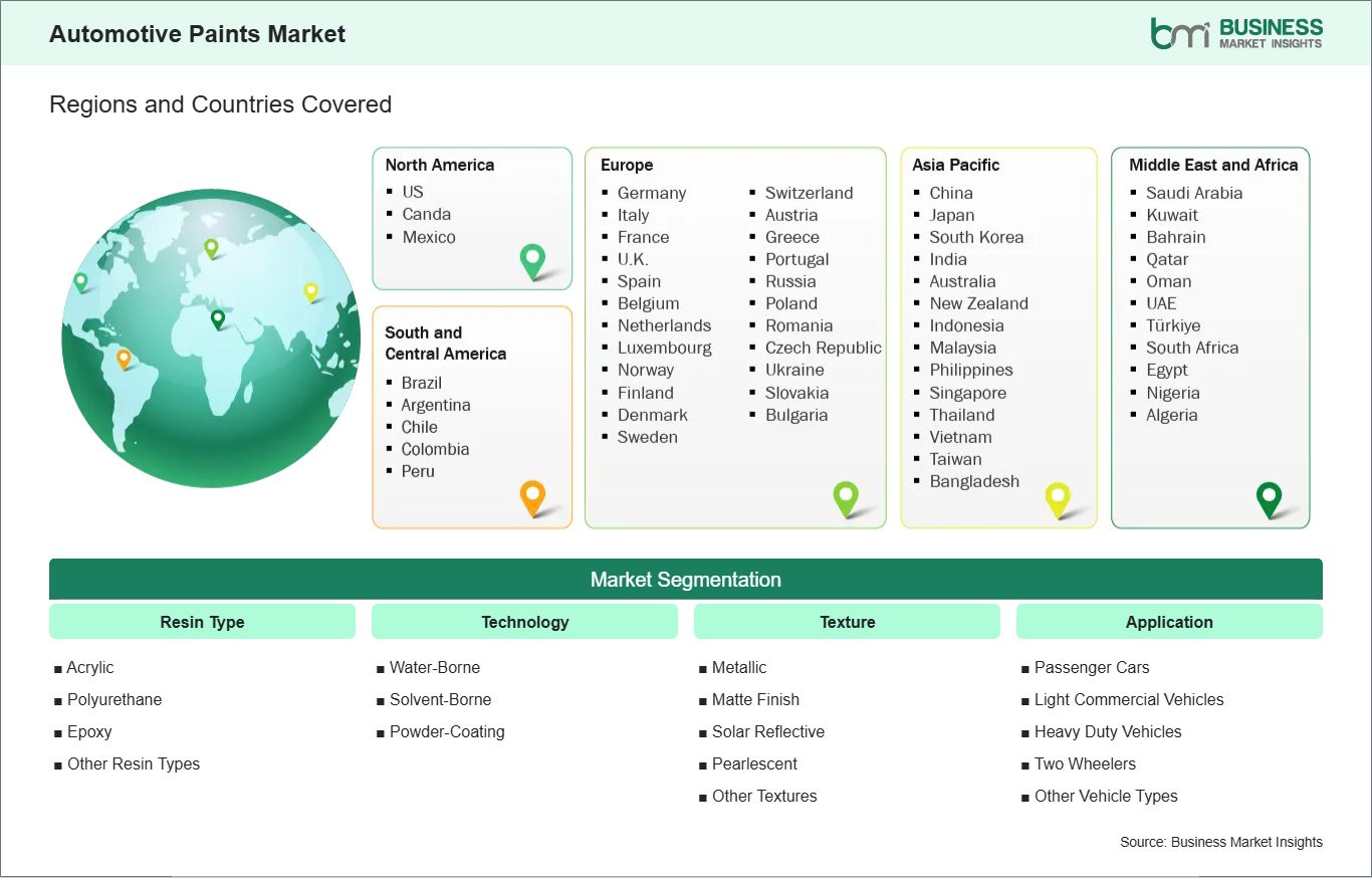 The geographical scope of the Automotive Paints market report is divided into five regions: North America, Asia Pacific, Europe, the Middle East & Africa, and South & Central America. The Asia Pacific Automotive Paints Market is segmented into China, Japan, South Korea, India, Australia, New Zealand, Indonesia, Malaysia, the Philippines, Singapore, Thailand, Vietnam, Taiwan, Bangladesh, and the Rest of Asia Pacific. Asia Pacific's fast growth in automotive production, especially in passenger cars and electric vehicles, positions it as a key player in the automotive paints market. The region benefits from strong manufacturing capacity, rising vehicle ownership, and a growing demand for long-lasting, high-quality finishes.