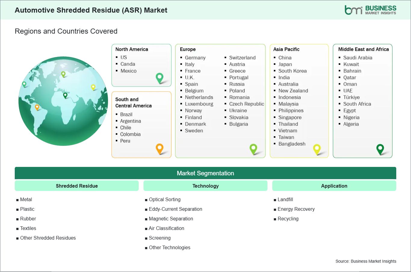 The geographical scope of the automotive shredded residue (ASR) market report is divided into five regions: North America, Asia Pacific, Europe, Middle East & Africa, and South & Central America. The Asia Pacific Automotive Shredded Residue (ASR) Market is segmented into China, Japan, South Korea, India, Australia, New Zealand, Indonesia, Malaysia, the Philippines, Singapore, Thailand, Vietnam, Taiwan, Bangladesh, and the Rest of Asia Pacific. Asia Pacific's fast industrial growth and expanding automotive recycling infrastructure make it a top region in the automotive shredded residue (ASR) market. More vehicle ownership, increasing numbers of end-of-life vehicles, and stricter waste management regulations support the growth of the market. Demand for efficient material recovery, less reliance on landfills, and better use of resources also drive growth.