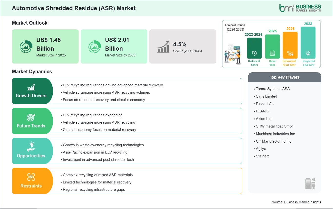 The Automotive Shredded Residue (ASR) Market is valued at US$ 1.45 Billion in 2025, it is projected to reach US$ 2.01 Billion by 2033.