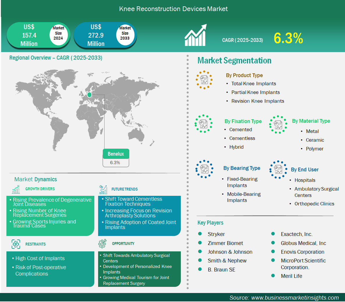 As per our report Benelux Knee Reconstruction Devices Market, the market size is valued at US$ 157.4 Million in 2024, projecting it to reach US$ 272.9 Million by 2033. This translates to a CAGR of approximately 6.3% during the forecast period.