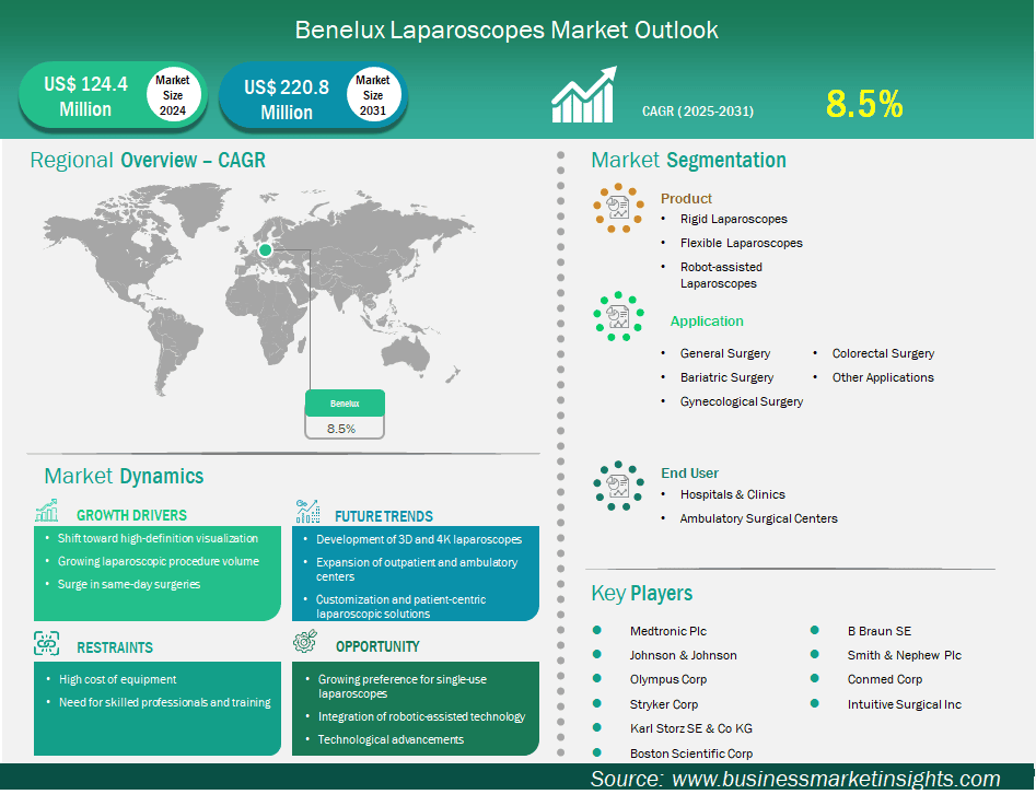 As per our report Benelux Laparoscopes Market, the market size is valued at US$ 124.4 Million in 2024, projecting it to reach US$ 220.8 Million by 2031. This translates to a CAGR of approximately 8.5% during the forecast period.