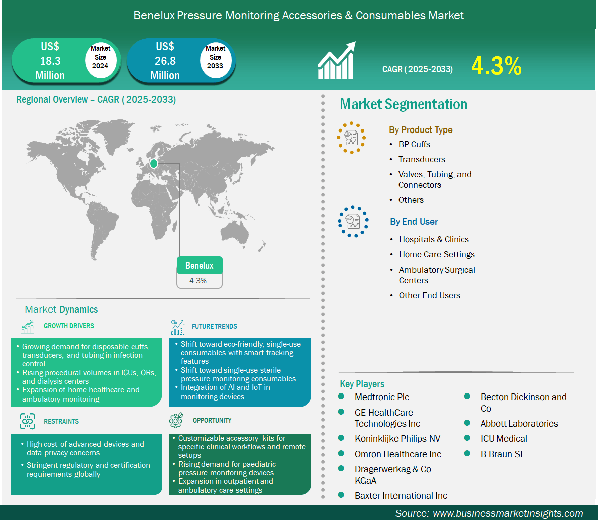 The Benelux Pressure Monitoring Accessories & Consumables Market is valued at US$ 18.3 Million in 2024, it is projected to reach US$ 26.8 Million by 2033.