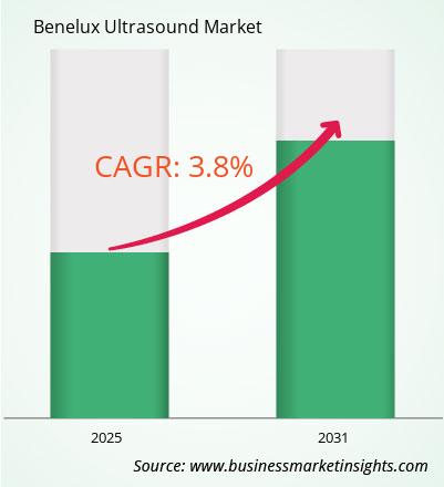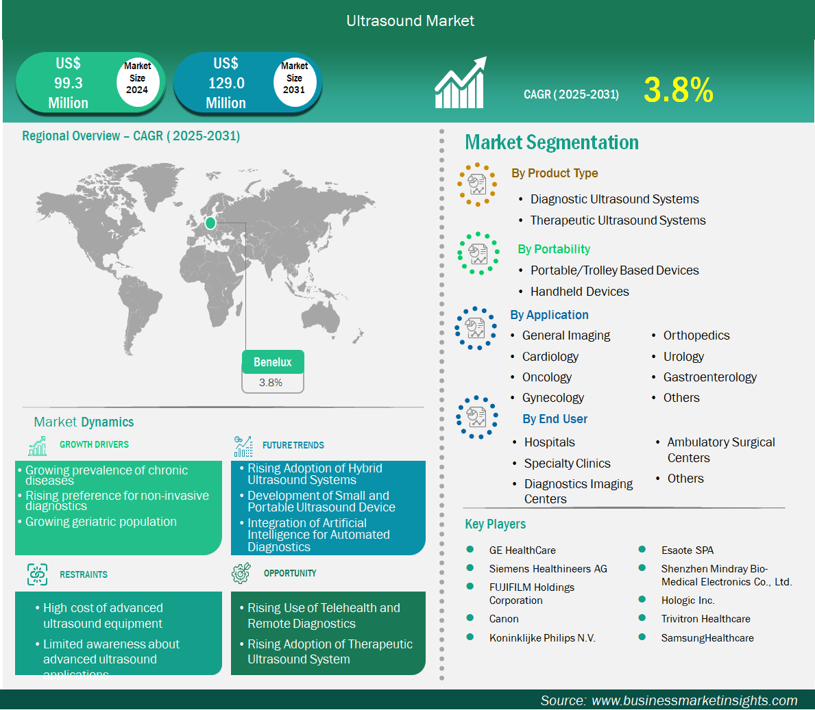 The Benelux Ultrasound Market is valued at US$ 99.3 Million in 2024, it is projected to reach US$ 129.0 Million by 2031.