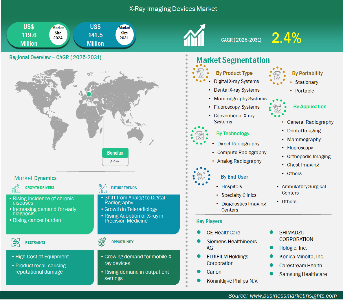 The Benelux X-Ray Imaging Devices Market is valued at US$ 119.6 Million in 2024, it is projected to reach US$ 141.5 Million by 2031.