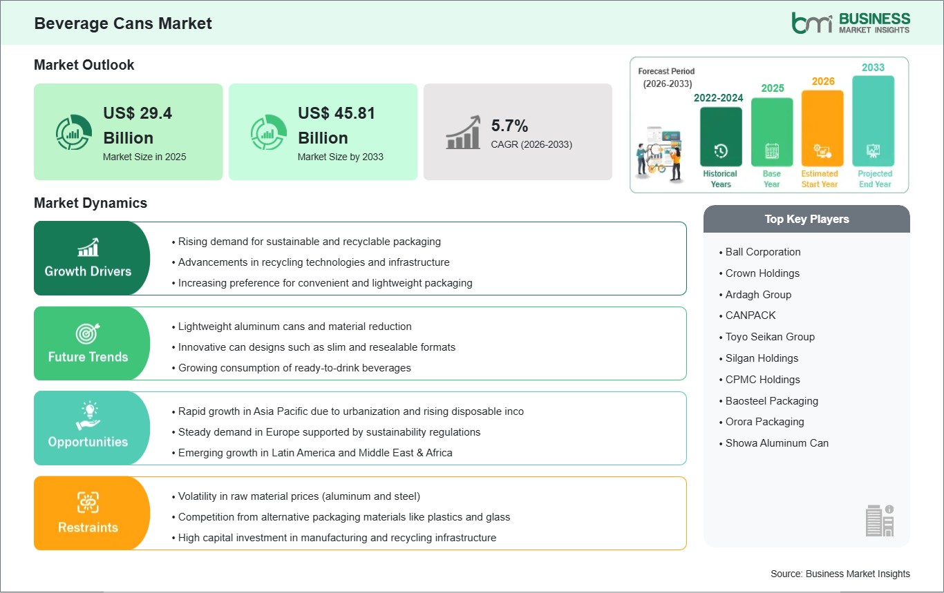The Beverage Cans Market size is expected to reach US$ 45.81 Billion by 2033 from US$ 29.4 Billion in 2025 .The market is estimated to record a CAGR of 5.7% from 2026 to 2033.
