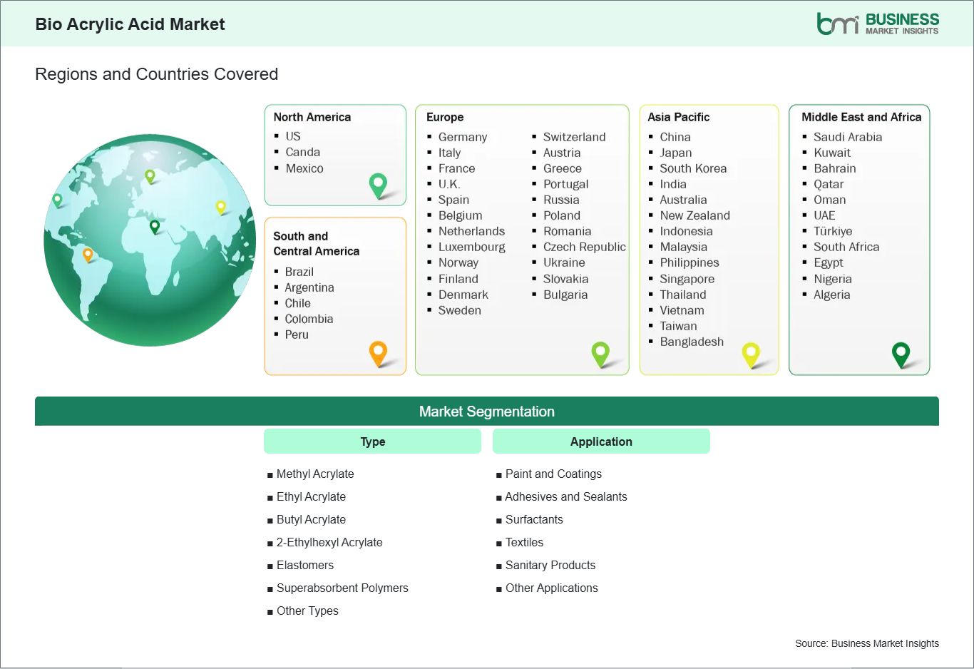 The geographical scope of the bio acrylic acid market report is divided into five regions: North America, Asia Pacific, Europe, Middle East & Africa, and South & Central America. The Asia Pacific Bio Acrylic Acid Market is segmented into China, Japan, South Korea, India, Australia, New Zealand, Indonesia, Malaysia, the Philippines, Singapore, Thailand, Vietnam, Taiwan, Bangladesh, and the Rest of Asia Pacific. Asia Pacific's fast industrial growth, increasing consumer awareness, and rising demand for eco-friendly chemicals position it as a crucial area for the bio acrylic acid market. The region benefits from growing industries such as hygiene products, paints and coatings, adhesives, and construction materials.