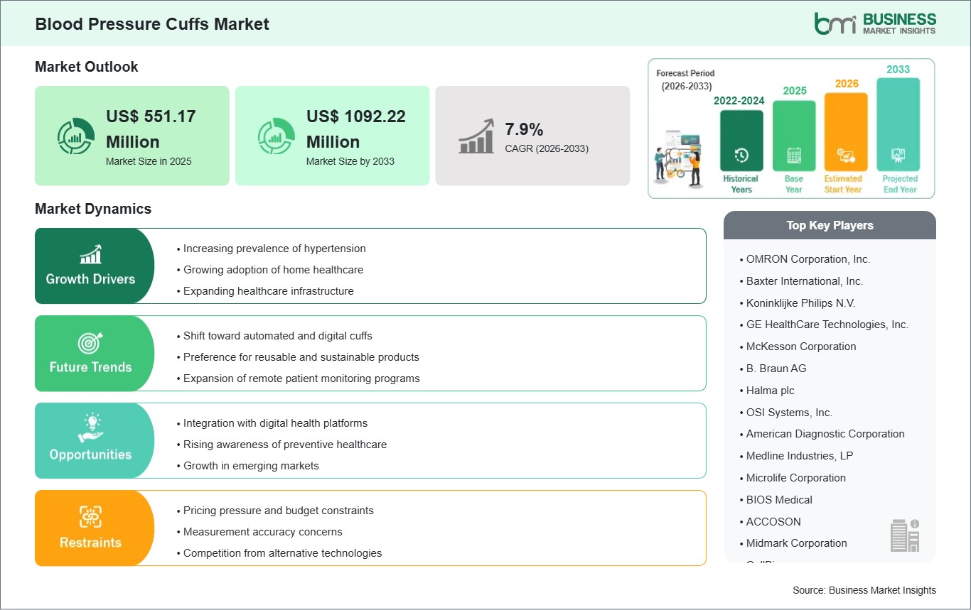 As per our report Blood Pressure Cuffs Market, the market size is valued at US$ 551.17 Million in 2025, projecting it to reach US$ 1092.22 Million by 2033. This translates to a CAGR of approximately 7.9% during the forecast period.