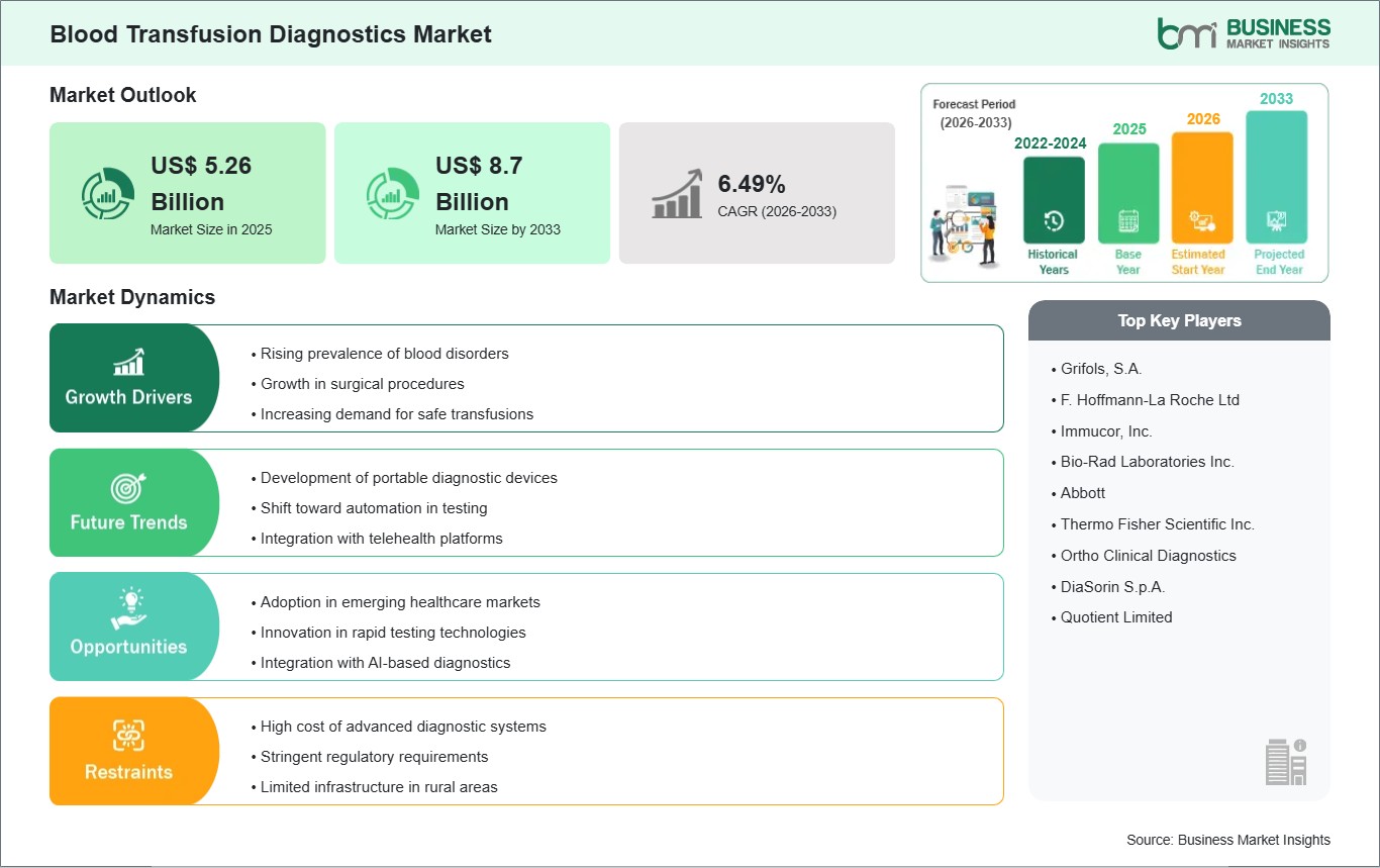 The Blood Transfusion Diagnostics Market is valued at US$ 5.26 Billion in 2025, it is projected to reach US$ 8.7 Billion by 2033.